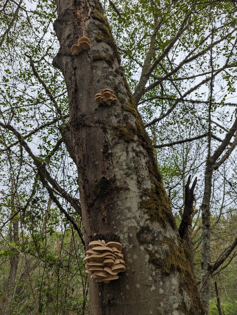 May 1, 2023: For the first outing specifically targeting oysters, I headed up towards Squak Mountain where a previous hike had revealed a lot of alder across a decent span of elevation (400'-1,200'). The lower elevation takes you through a retired RV park that must have had 100+ units. The old gravel roads make it easy to zig zag through the woods where the brush can get pretty hostile.The first batch was well past its prime and next year I will know to keep walking but back then I didn't appreciate just how hospitable oysters are to all sorts of bugs and their larva. I grabbed the few that were not dried and then spent two more hours looking at hundreds of alders and no edible mushrooms...